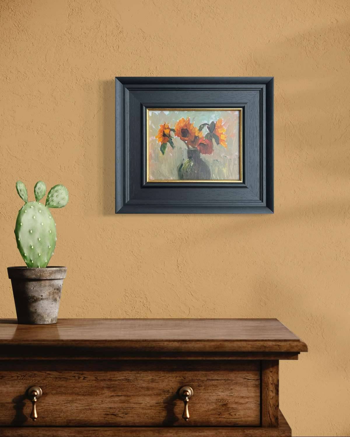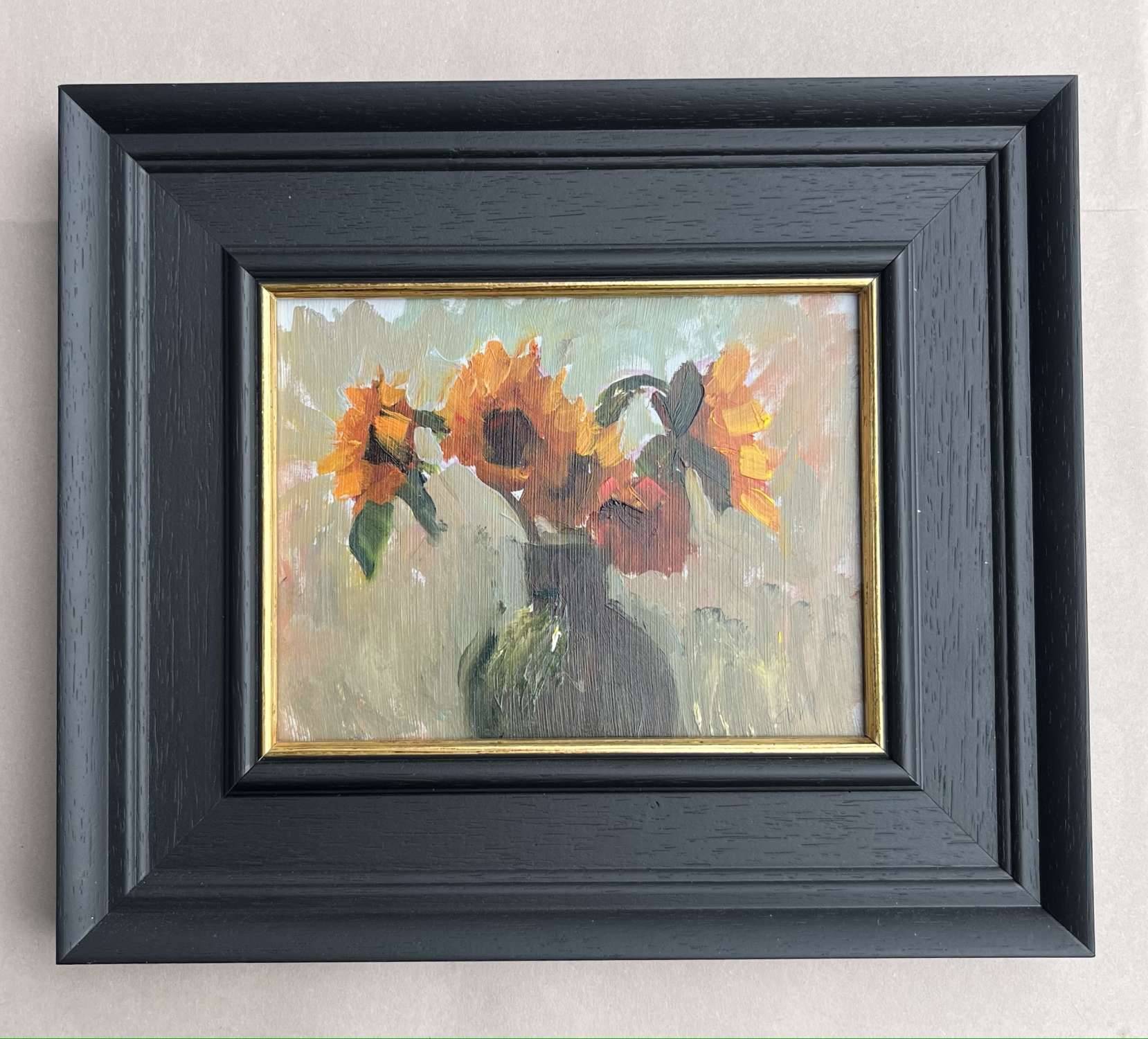 Painted from life in an impressionistic style, this work depicts sunflowers in a green vase set before a window in the early morning. The composition captures the rich, dark oranges of the blooms illuminated by soft natural light. Presented in a black frame with a painted gold inlay, the framing enhances and offsets the warm tones of the flowers.
