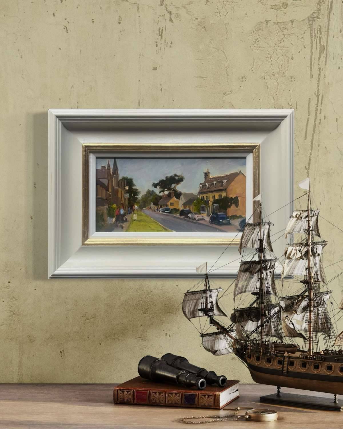 A plein air, alla prima, original oil on board, painted on location to capture the unique character of Broadway High Street on a lively, bustling day. If you look closely, you might just spot the Porsche that found its way into the scene.